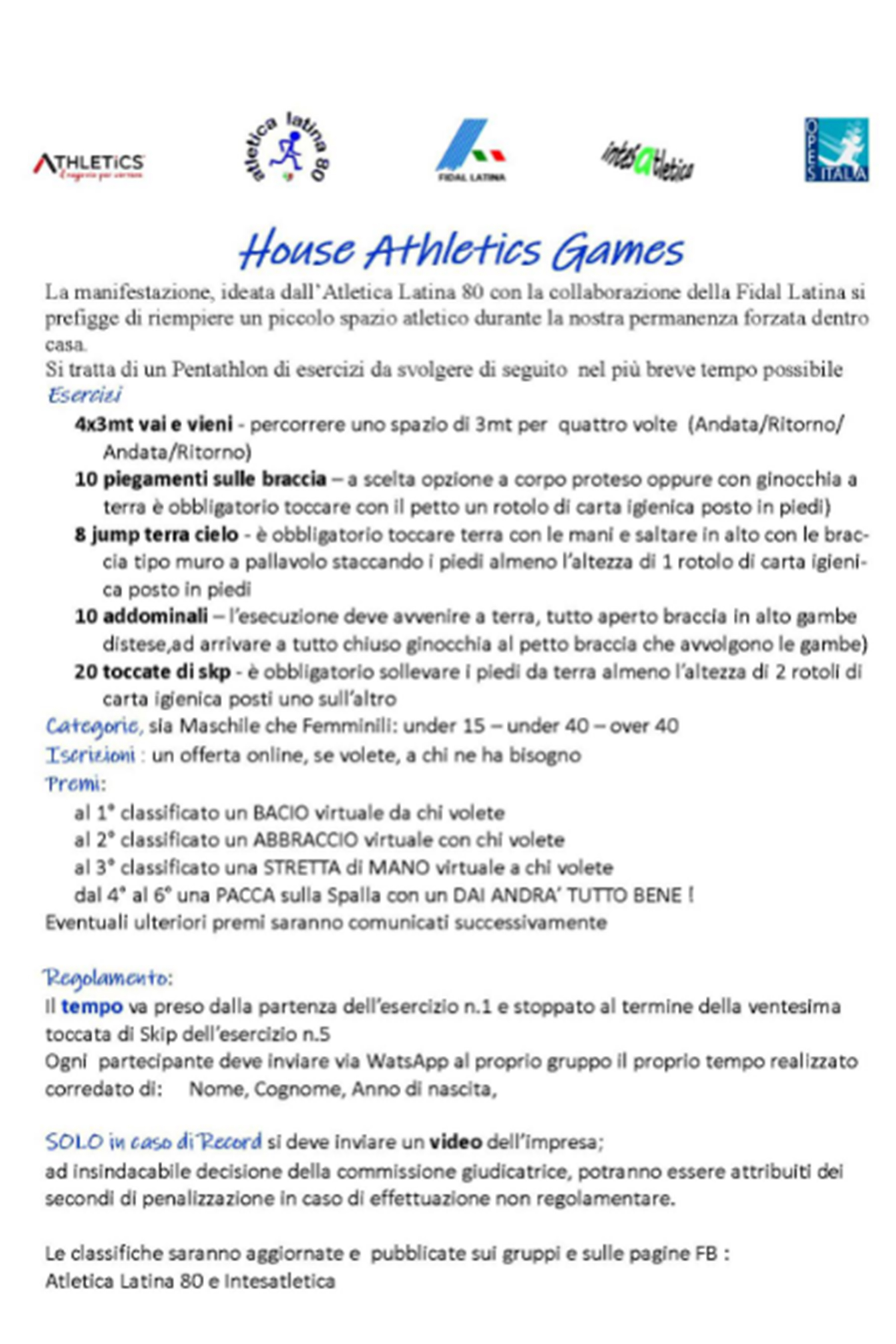 I VIDEO E LE INIZIATIVE – Proponiamo alcuni video autoprodotti dalle società laziali, sull’allenamento degli atleti e iniziative volte a sollecitare l’attività competitiva anche all’interno delle mura di casa! Sono i video di Studentesca Milardi, Atletica Frascati, RCF Roma Sud, ACSI Italia Atletica e Atletica Latina 80. E non solo. A lato c’è anche il simpatico programma ideato proprio dall’Atletica Latina 80 e Intesatletica. Le ricompense: affettuose… ma a distanza! Sui nostri social altri contribuiti aggiornati quotidianamente. Taggateci!