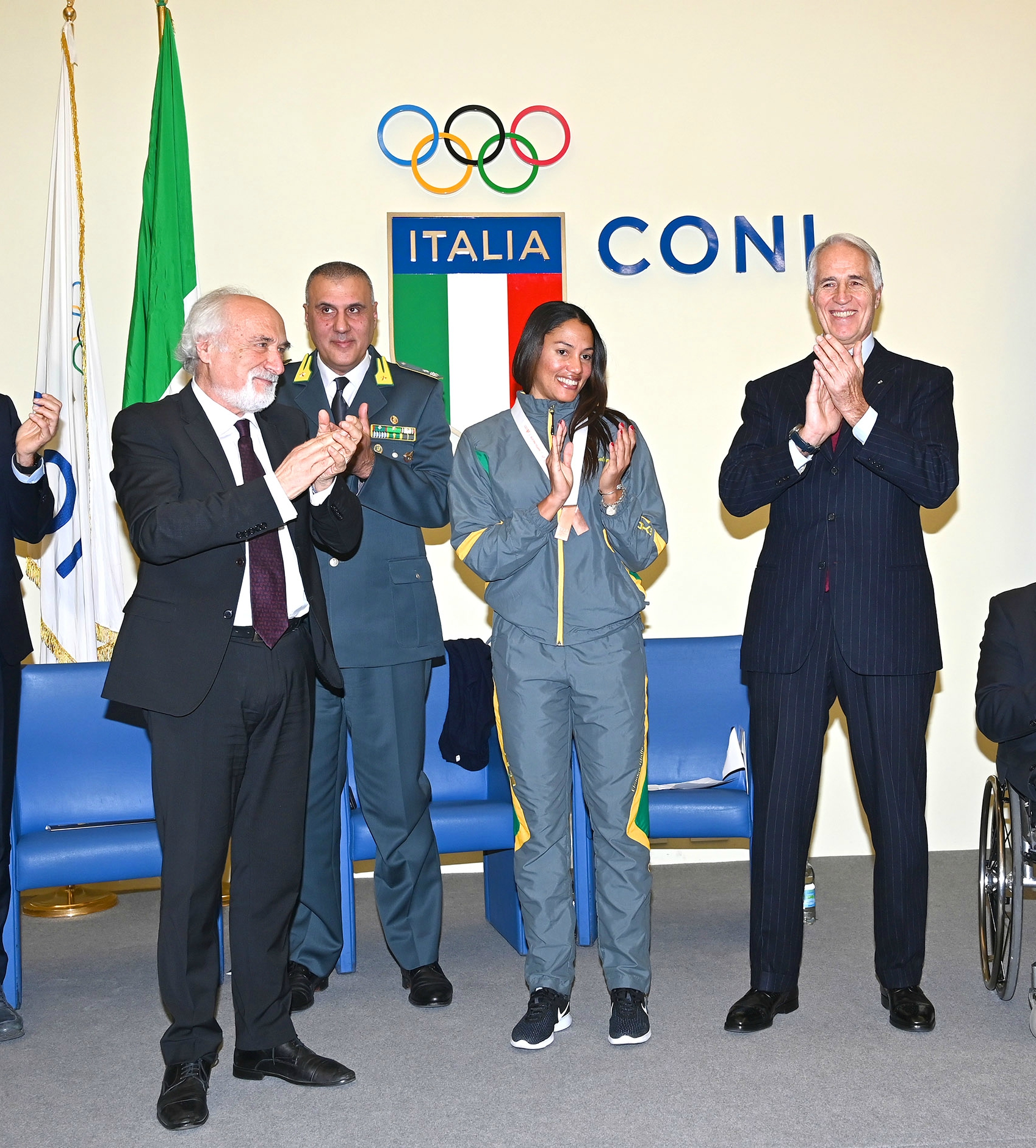 | 18 Dicembre 2019 Giorgi premiata dal ministro Bonafede Festa delle Fiamme Azzurre al Salone d'Onore del CONI, l'applauso del ministro della Giustizia alla marciatrice medaglia di bronzo nella 50 km ai Mondiali di Doha | |