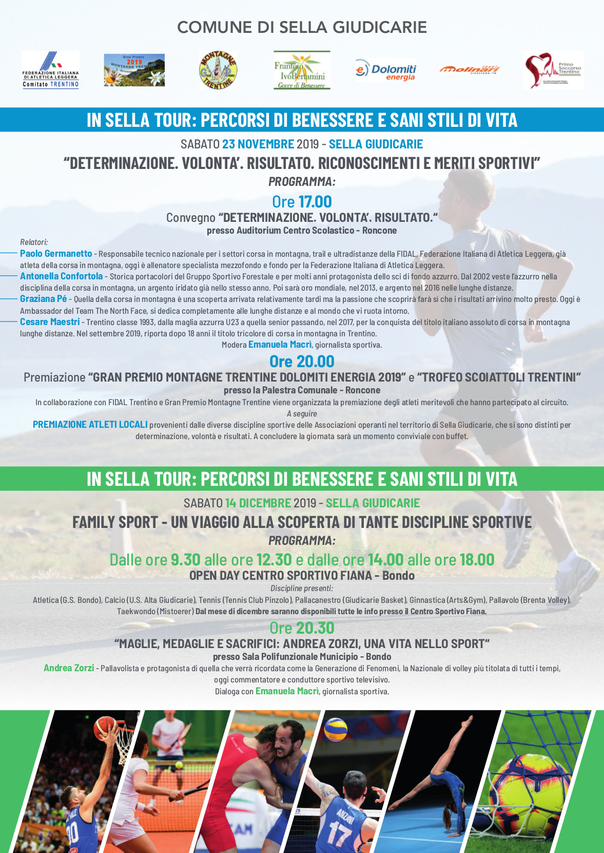 | 17 Novembre 2019 Sabato convegno e premiazione GP Montagne Trentine Dolomiti Energia Appendice di grande valore per la stagione della Corsa in Montagna azzurra: sabato a Roncone / Sella Giudicarie prestigioso convegno con Maestri, Germanetto, Confortola ed a seguire premiazione del GP Montagne Trentine Dolomiti Energia | |