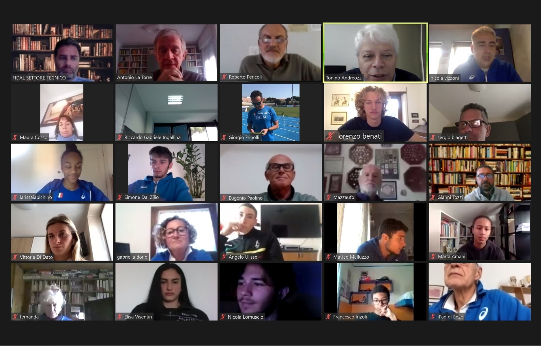 | 25 Novembre 2020 Web-raduno degli azzurrini: “Uniti verso il 2021” L’incontro virtuale di oltre 100 atleti della Nazionale giovanile. Il vice dt Andreozzi: “Questo 2020 non è stato un anno perso e il prossimo sarà intensissimo”. Iapichino e Benati nominati capitani under 20 | |