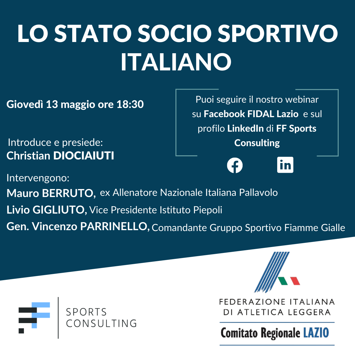 | 12 Maggio 2021 C'è il webinar ''Lo stato socio sportivo italiano'' Giovedì 13 maggio alle 18.30 sulla pagina FB di FIDAL Lazio il secondo appuntamento con la serie di webinar organizzati da FIDAL Lazio e FF Sportsconsulting | |