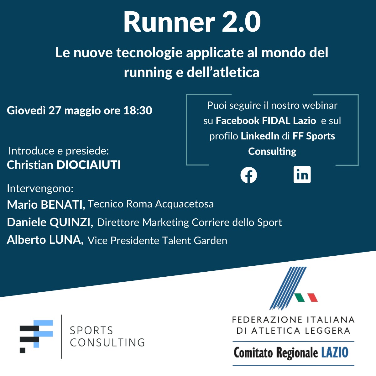 | 26 Maggio 2021 ''Runner 2.0'': altro webinar con FIDAL Lazio Continuano gli appuntamenti di FIDAL Lazio e FF Sports Consulting. Giovedì 27 maggio si parla delle nuove tecnologie applicate al mondo del running e dell'atletica | |