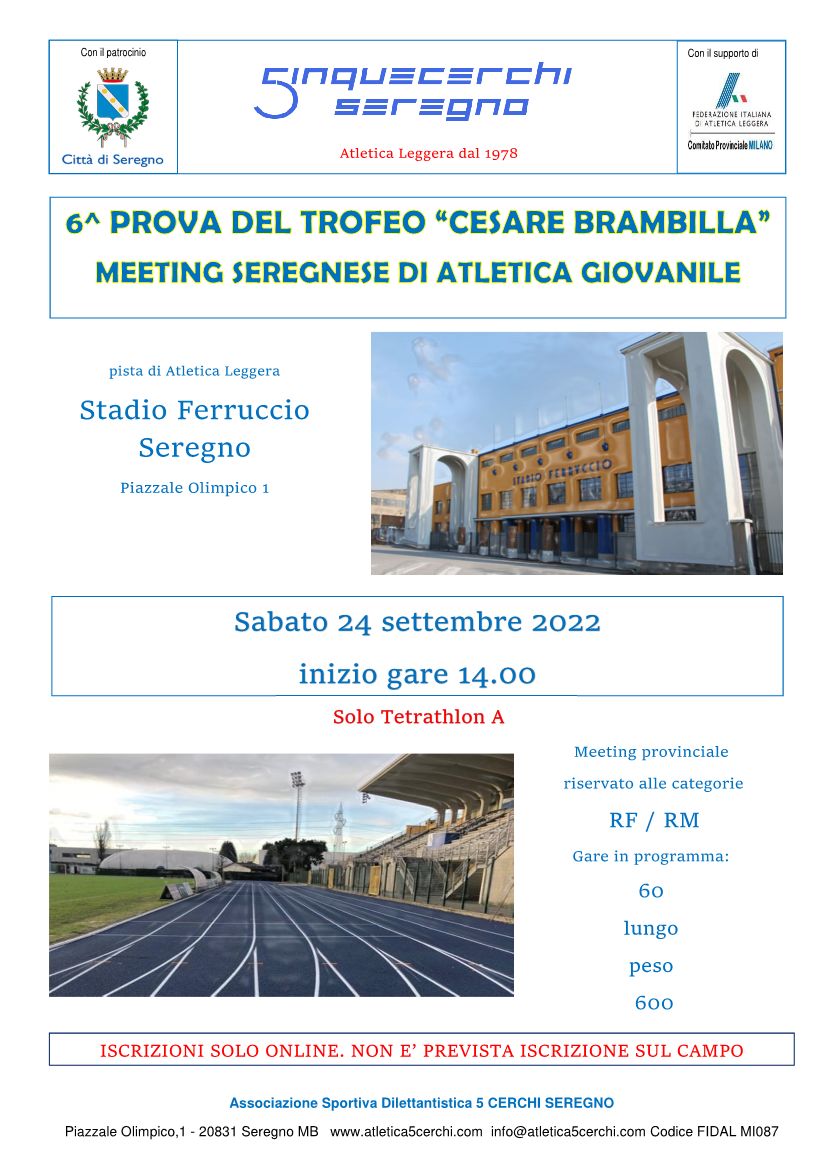 | 20 Settembre 2022 Tetrathlon Rag. tra Seregno e Concorezzo Sabato 24 settembre due tetratlhon in contemporanea tra Seregno e Concorezzo, ultima gara prima della finale regionale del Trofeo Nazionale delle Province | |