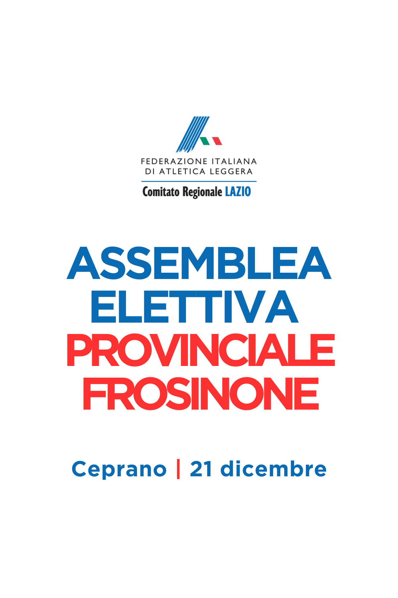 | 31 Ottobre 2024 FIDAL Frosinone, assemblea elettiva Il 21 dicembre a Ceprano l’Assemblea Provinciale FIDAL Frosinone: i documenti per le elezioni |