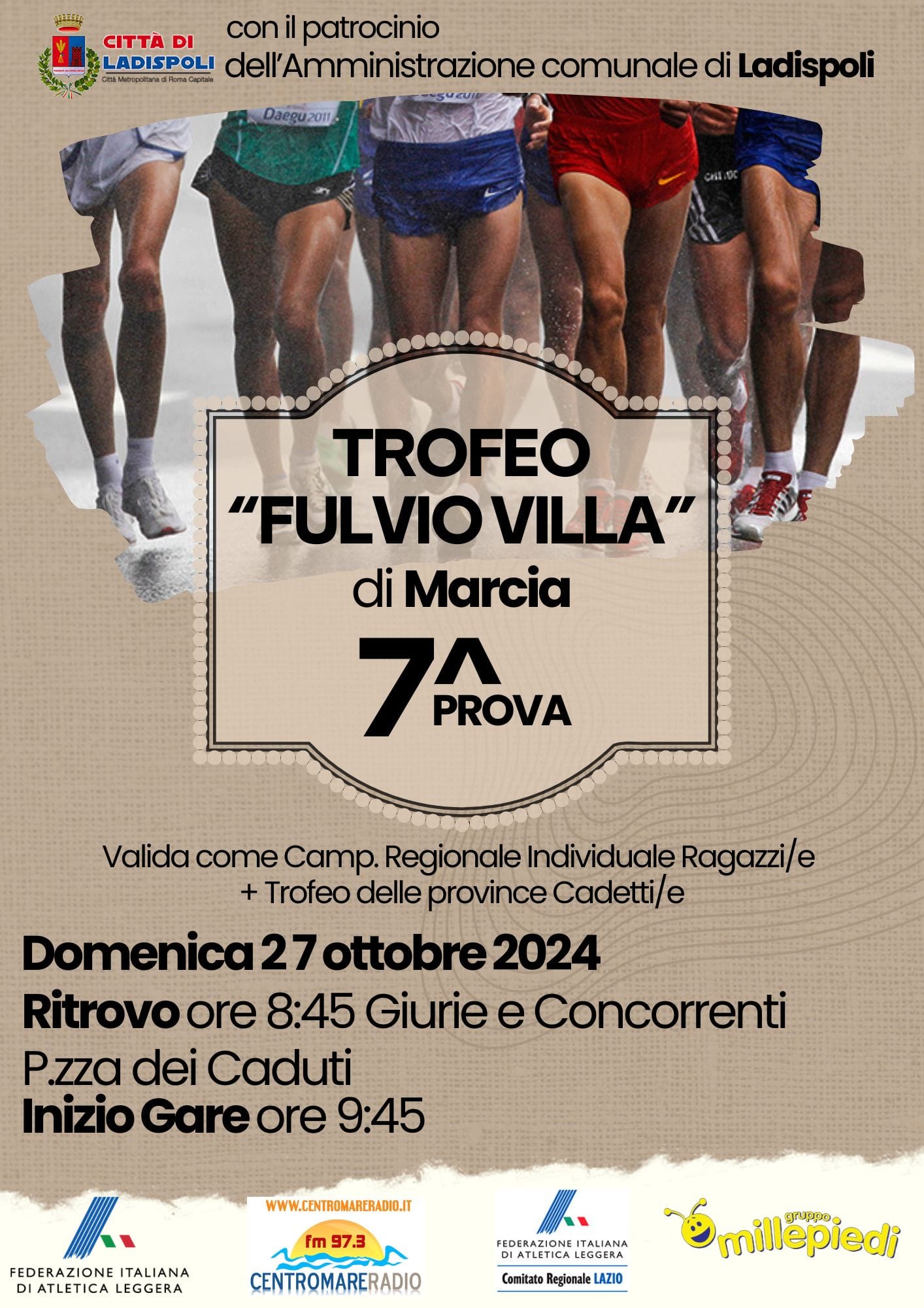 | 24 Ottobre 2024 Il ''Villa'' fa tappa a Ladispoli Il Trofeo "Fulvio Villa" di Marcia giunge alla sua 7ª prova, che si terrà domenica 27 ottobre 2024 nella città di Ladispoli | |