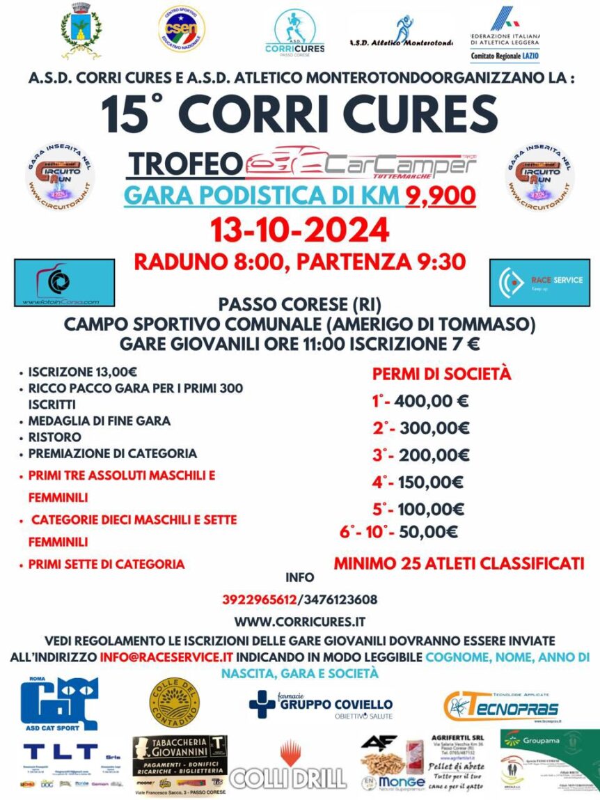 | 08 Ottobre 2024 C'è la Corri Cures, 15esima edizione Come di consueto, domenica 13 ottobre 2024 alle ore 9:30 a Passo Corese (Rieti), prenderà il via l’edizione numero quindici della Corri Cures – Trofeo Car Camper | |