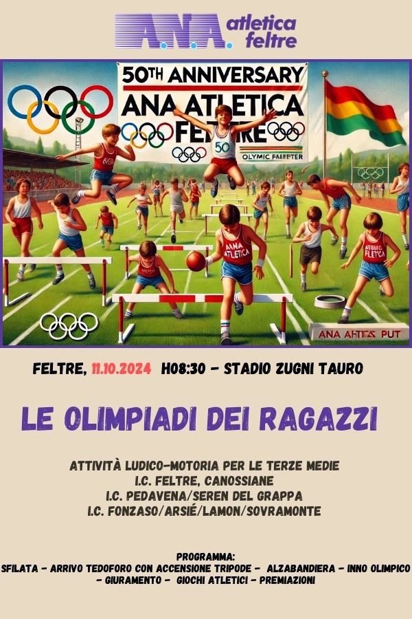 | 09 Ottobre 2024 Ana Feltre in pista con le Olimpiadi dei Ragazzi Venerdì 11 ottobre si rinnovo l'appuntamento con le scuole del comprensorio feltrino | |