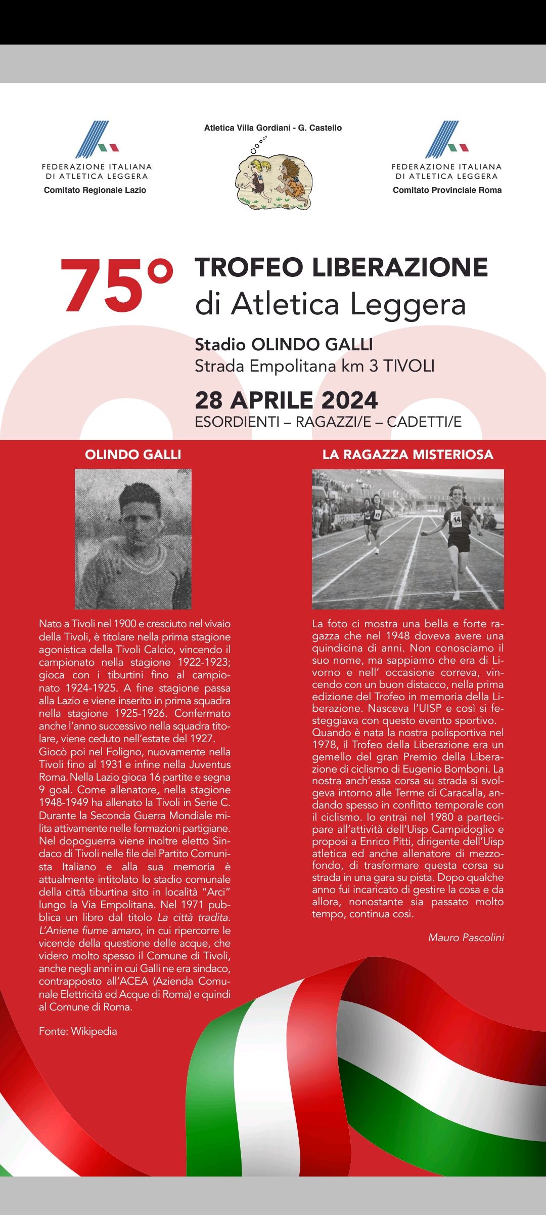 | 27 Aprile 2024 75° TROFEO LIBERAZIONE GIOVANILE TIVOLI 28 APRILE ESORDIENTI RAGAZZI E CADETTI A TIVOLI. |