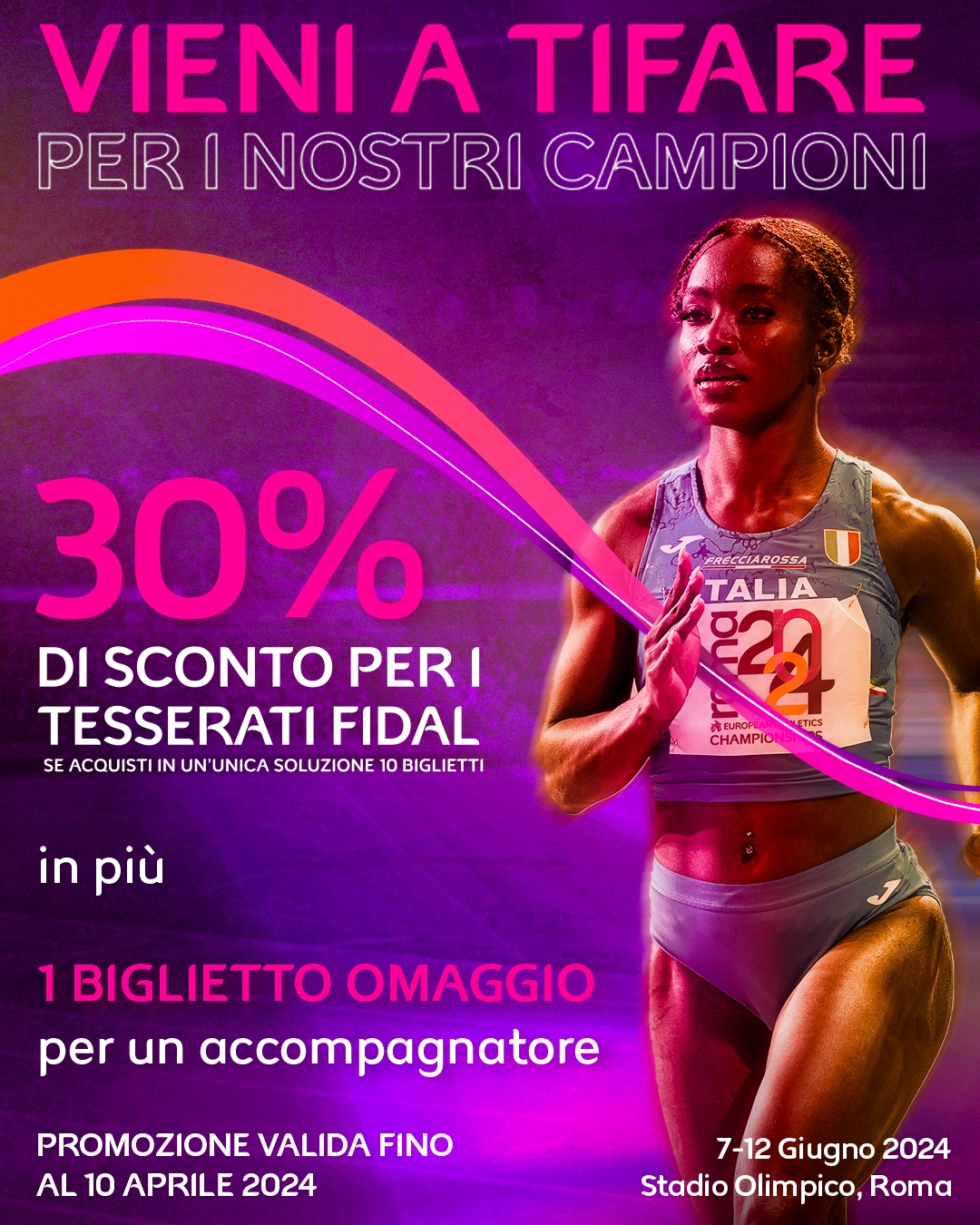 | 13 Marzo 2024 Roma24: riduzione 30% per tesserati FIDAL Da oggi si può aderire alla promozione sui pacchetti di 10 biglietti per assistere agli Europei dal 7 al 12 giugno allo stadio Olimpico. C’è tempo fino al 10 aprile. | |
