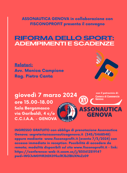 | 04 Marzo 2024 Convegno “Riforma dello Sport: adempimenti e scadenze” CONVEGNO GENOVA GIOVEDI 7 MARZO 2024 "RIFORMA DELLO SPORT: ADEMPIMENTI E SCADENZE" | |