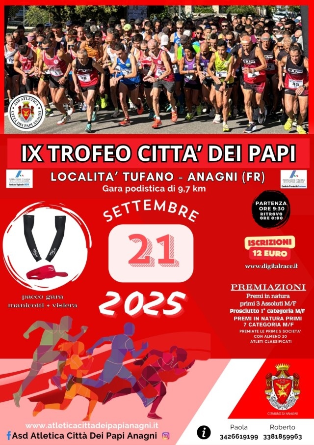 | 17 Settembre 2025 Ad Anagni il Trofeo Città dei Papi E’ arrivata alla IXª edizione, la gara su strada del Trofeo Città dei Papi, che si svolgerà domenica 21 settembre ad Anagni, in provincia di Frosinone | |