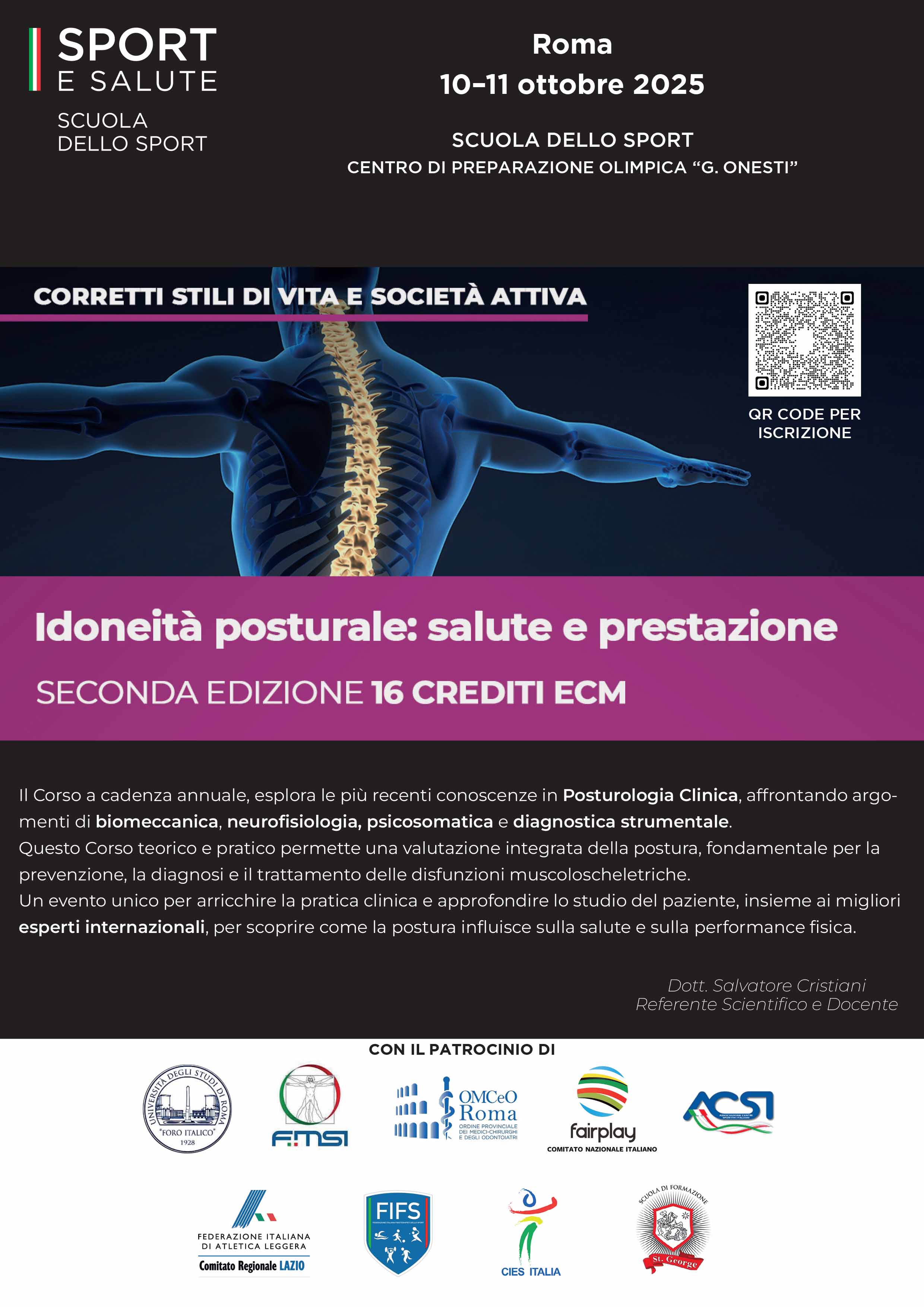 | 24 Settembre 2025 Posturologia Clinica: corso Scuola dello Sport Nuovo Corso di Posturologia Clinica con patrocinio FIDAL Lazio: teoria e pratica su postura, prevenzione e performance. 16 crediti ECM, con i migliori esperti internazionali. Appuntamento 10 e 11 ottobre | |