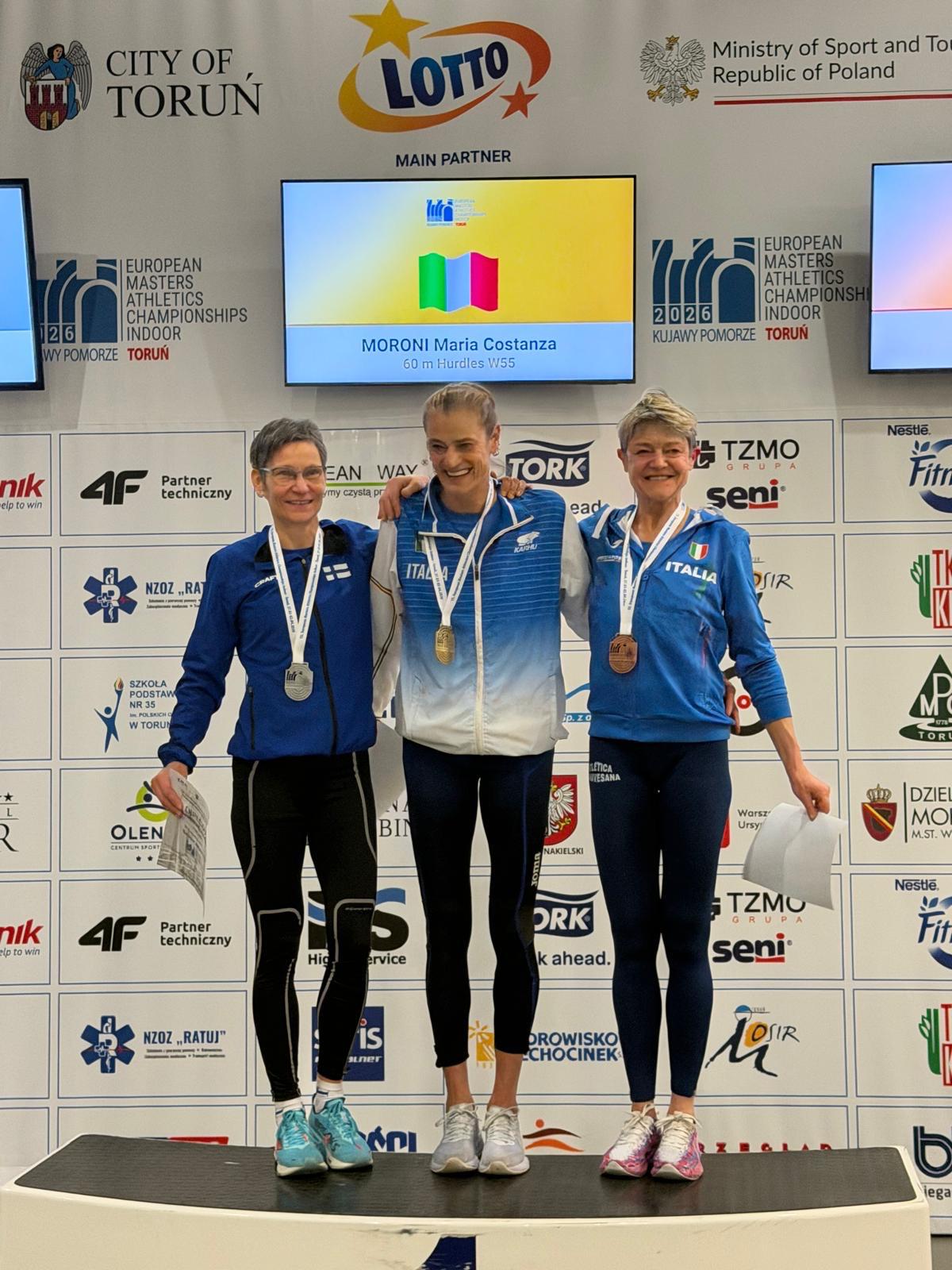 | 08 Aprile 2026 Master. Moroni bi-campionessa europea indoor A Torun, la biellese conquista il titolo sui 60hs e nel lungo, categoria W55, facendo segnare in entrambi i casi anche la MPI. Bronzo individuale per Ivana Ferrio sui 60hs, di squadra nel cross M35 per il cuneese Christian Olmo. | |